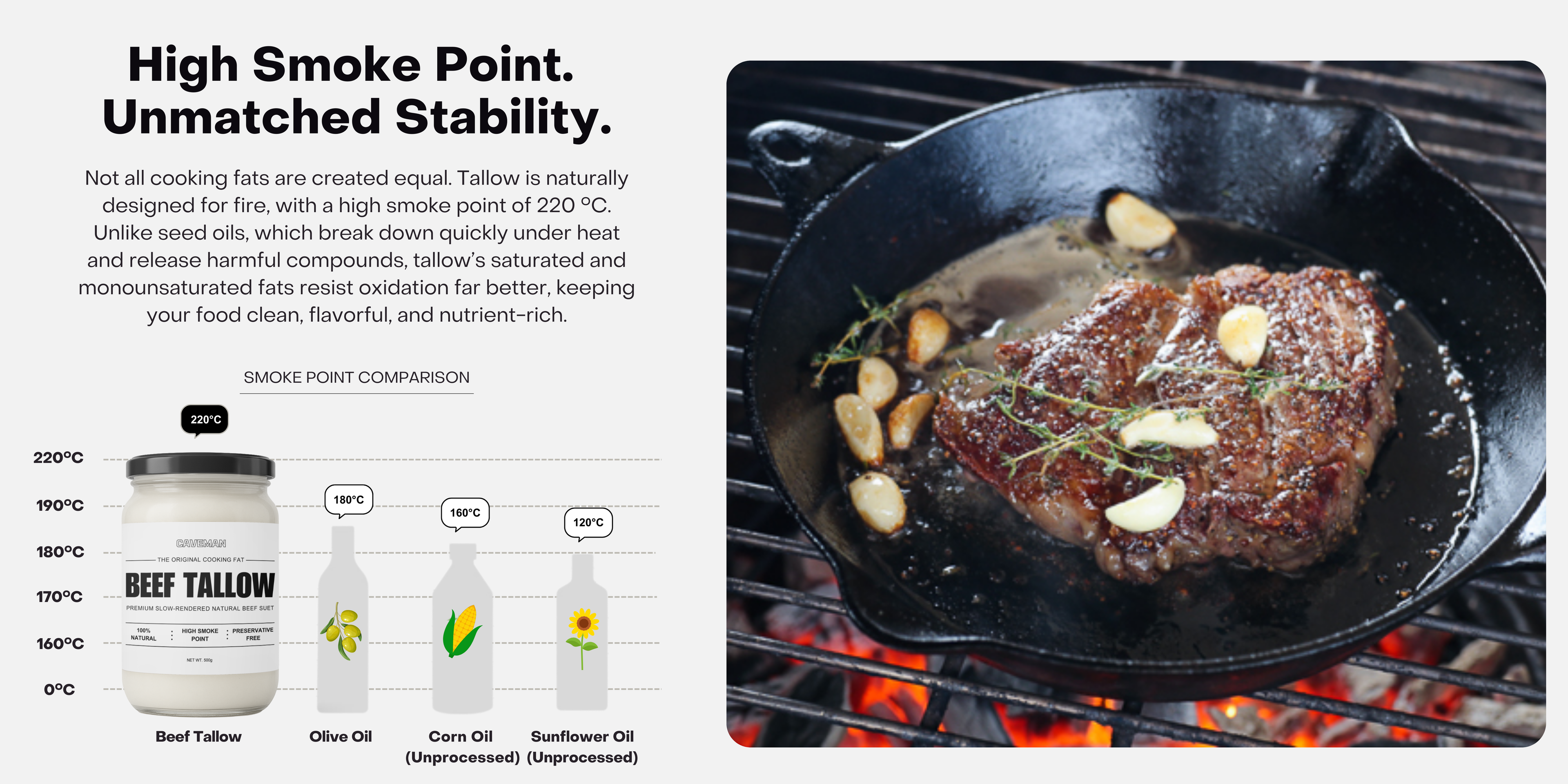Beef tallow is one of the most nutrient-dense cooking fats you can use. It’s 100% natural, minimally processed, and free from harmful seed oils, artificial additives, or preservatives. Tallow is packed with vitamins A, D, E, and K and It supports brain function, hormone balance, and long-lasting energy without blood sugar spikes. With a smoke point of around 220°C , tallow is perfect for high-heat cooking — whether you're roasting, frying, or sautéing. It stays stable at high temperatures, unlike many oils that break down and release toxic compounds.